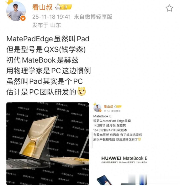 数码博主看山叔近日爆料指出,这款设备虽然命名为MatePad Edge,但其型号代号为QXS(钱学森),延续了华为PC产品线以物理学家命名的传统。初代MateBook代号为赫兹,这一命名规则暗示MatePad Edge实为由华为PC团队研发的产品,本质上是一台二合一笔记本电脑。