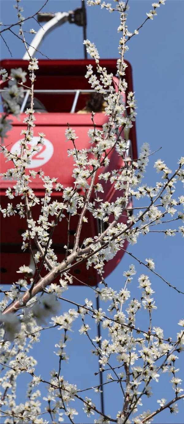 沿着青石阶拾级而上,迎春花已为山麓织就金黄锦缎。细长的枝条垂落如瀑,千万朵小花在晨光中闪烁,恍若佛前供奉的盏盏明灯。行至桃园,粉白花瓣如云似雾,薄如蝉翼的柔光里,冰纹石径蜿蜒穿过花海,风过时簌簌飘落的花瓣,恰似天女遗落的霓裳。东门、西门与弥勒胜苑的迎春花率先点燃春信,而桃园的山桃则以三月的芬芳续写禅意——当花瓣轻触肩头,不妨驻足闭目,让“人面桃花相映红”的古典意境,在山风中化作一缕空灵的梵音。