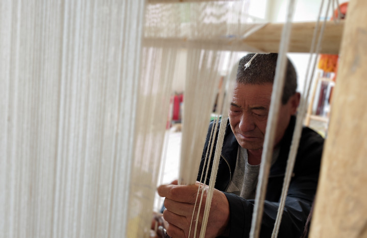 裁剪、打磨、捻线、打结、平整……在青海省西宁市湟中区上新庄镇,在一块正在编织的老虎图案藏毯前,加牙藏毯非遗代表性传承人杨永良正在手把手给徒弟教学。杨永良介绍,3000多年前,居住在青藏高原的民众就开始编织一种叫“毛席”的原始地毯,可谓藏毯的雏形。“一块藏毯,白天是坐垫,晚上是被子,小块的还能铺在马鞍上。最初藏毯的编织工艺是手捻纱,由于毛纱粗细不匀,旧时的地毯展现出了一种古朴的美。”杨永良说。