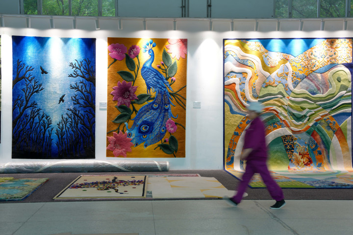 9月27日,在西宁市圣源地毯集团有限公司生产车间,一名操作工从展示的藏毯前走过。新华社记者 杜笑微 摄