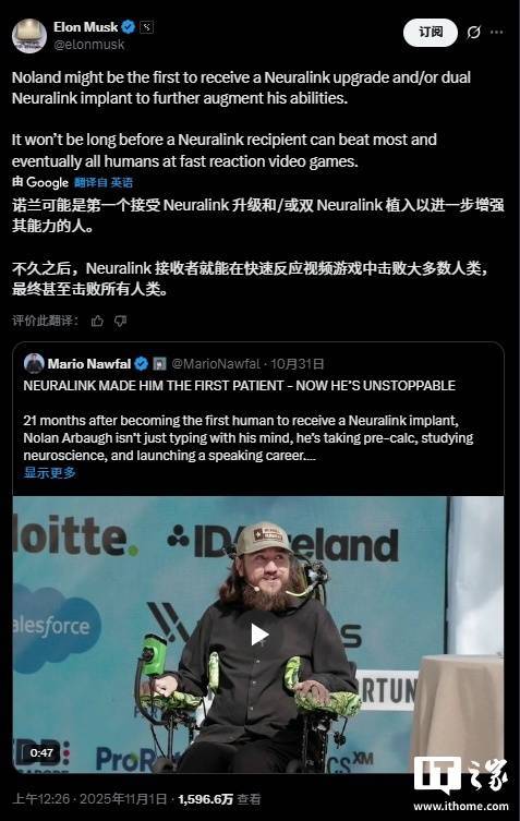 在回应中,马斯克表示,阿博可能成为首位接受 Neuralink 升级的患者。他在 X 平台上写道:“诺兰德或许会是首个获得 Neuralink 升级,甚至接受双侧 Neuralink 植入的人,以进一步增强其能力。在不久的将来,euralink 使用者将能在快速反应类电子游戏中击败大多数人,最终超越所有人。”